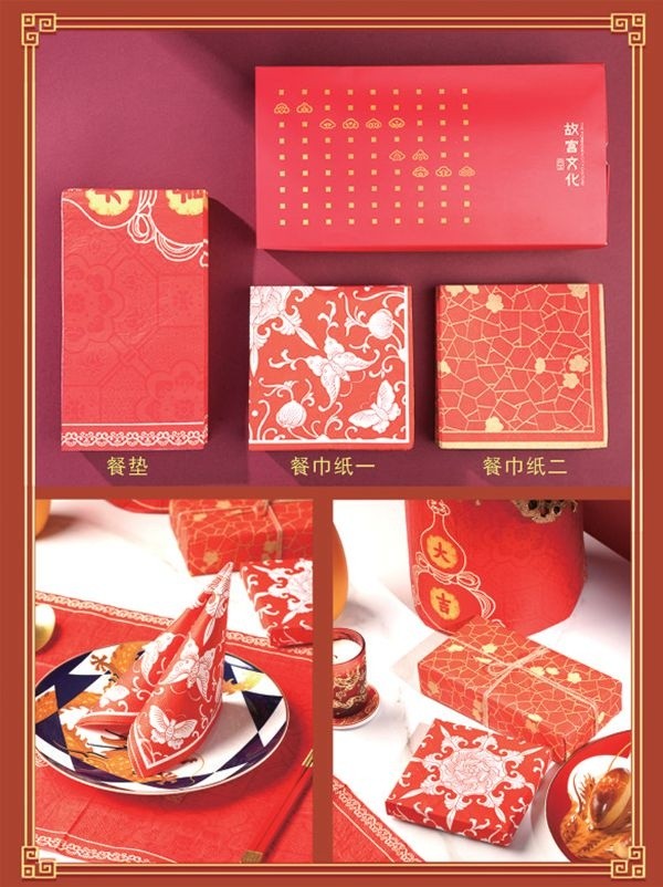 玉兔新年之际,点开京东、淘宝、故宫官方平台,一款喜庆的“彩色印花餐巾纸”特别引人注目,这正是“品萱”与故宫达成合作,历经数月努力而完成的纳福迎祥·餐巾纸套装礼盒。这不仅是“品萱”一次新的挑战,也是“品萱”在纸巾产品种类上一次新的突破。