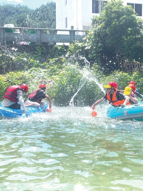 活动现场,大家自行组队,一艘艘漂流艇蓄势待发,顺着山边的滑道飞驰而过,一场紧张刺激的漂流之行随之而来,迎面而来的凉风与水珠冲刷掉夏日的酷热,水花声、尖叫声、欢笑声此起彼伏。大胆的员工早已遥遥领先,路过时,顺便解救被卡住的小伙伴,佛系的员工只能随波逐流……这场与夏日的约会不仅释放压力,也让青年员工们的心情得到彻底放松。