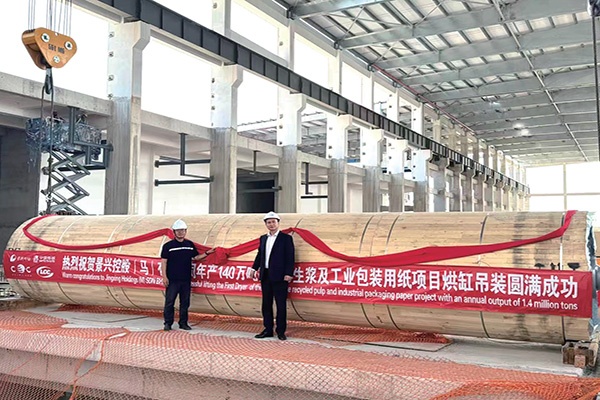 在全场嘉宾及项目执行团队的共同注视下,相关领导与安装代表携手完成烘缸首吊仪式,标志着景马二期项目正式进入设备安装施工攻坚阶段。