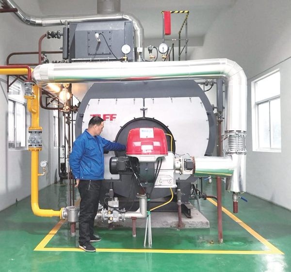 该锅炉由于装备有冷凝器和节能器,具备低碳、节能功效。其中冷凝器利用排烟温度、加热冷凝器至水箱循环的水(冷凝器通过冷凝泵将水箱水循环至冷凝器内部加热再回到水箱);节能器利用排烟温度加热给水温度,通过给水泵将水箱水经过节能器加热再进锅炉,实现低碳排放、节能目的。